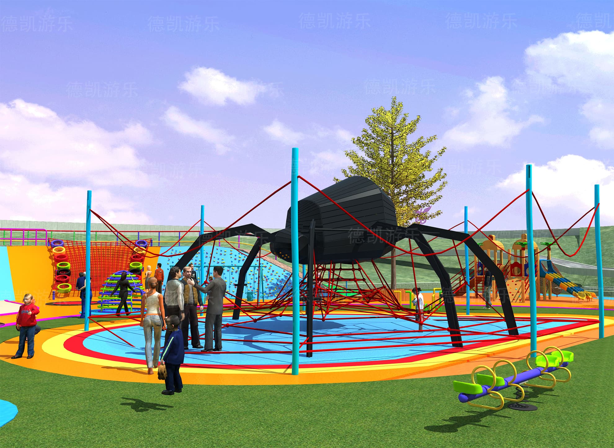 在總體效果圖中,我們大致可以看見這個(gè)游樂園的主要游樂設(shè)備:主體七彩滑梯、勇攀高峰、鉆網(wǎng)、拓展組合、地形游樂、蜘蛛游樂,且每個(gè)設(shè)備都有各自的區(qū)域范圍,構(gòu)成了這個(gè)完整的游樂園。游樂園也周圍環(huán)境相融合,融入到這座城市當(dāng)中,完善著城市的基礎(chǔ)功能。